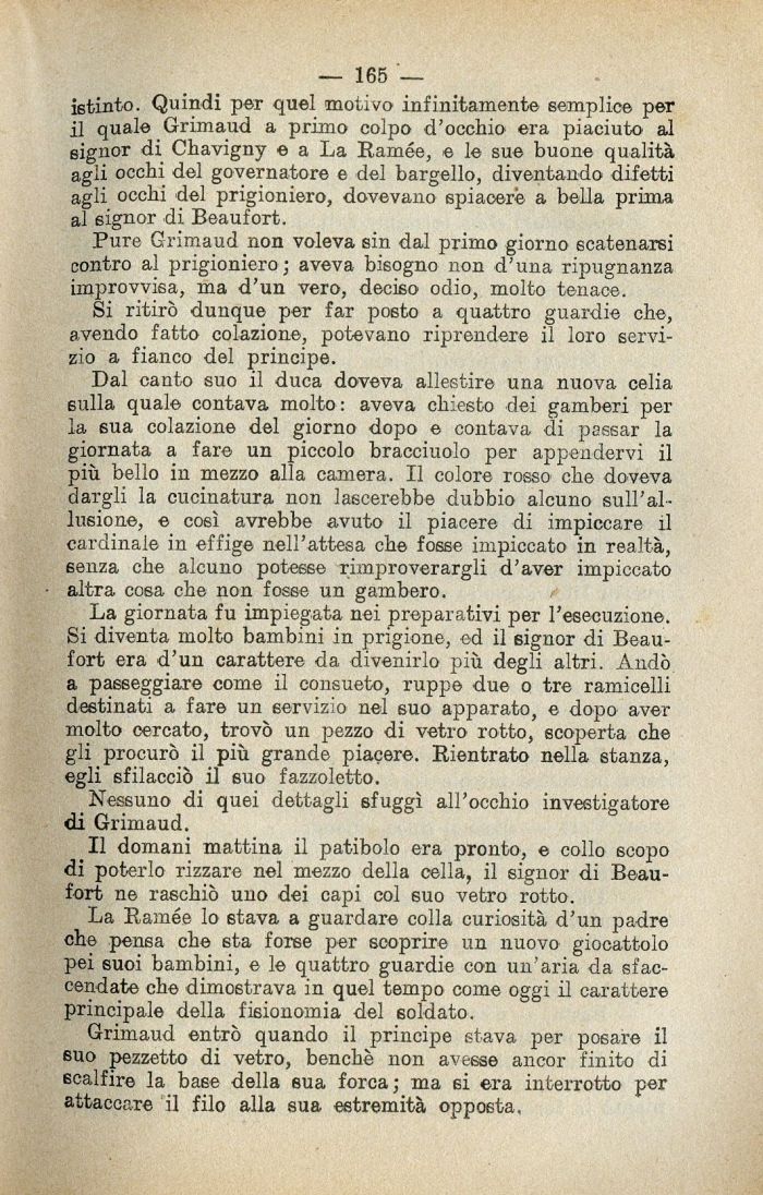 Dal canto suo il duca doveva allestire una nuova celia sulla quale contava molto: aveva chiesto dei gamberi per la sua colazione del giorno dopo e contava di passar la giornata a fare un piccolo bracciuolo per appendervi il più bello in mezzo alla camera. Il colore rosso che doveva dargli la cucinatura non lascerebbe dubbio alcuno sull'allusione, e così avrebbe avuto il piacere di impiccare il cardinale in effige nell'attesa che fosse impiccato in realtà, senza che alcuno potesse rimproverargli d'aver impiccato altra cosa che non fosse un gambero.