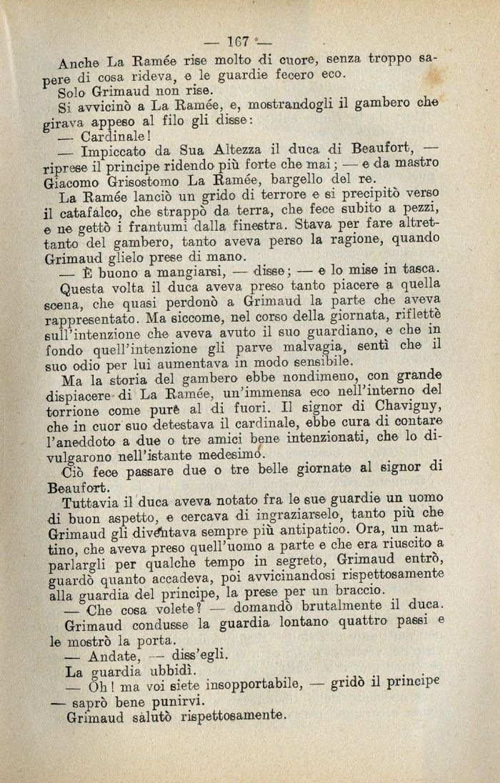 Tuttavia il duca aveva notato fra le sue guardie un uomo di buon aspetto, e cercava di ingraziarselo, tanto più che Grimaud gli diveltava sempre più antipatico. Ora, un mattino, che aveva preso quell'uomo a parte e che era riuscito a parlargli per qualche tempo in segreto, Grimaud entrò, guardò quanto accadeva, poi avvicinandosi rispettosamente alla guardia del principe, la prese per un braccio.
