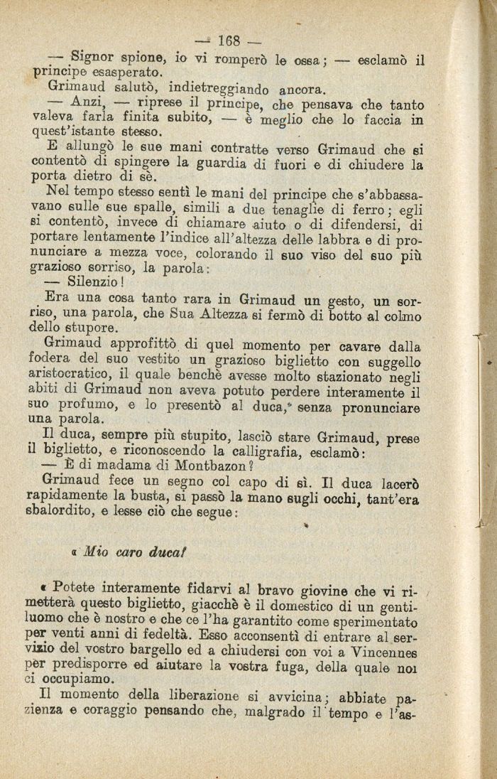 Il duca, sempre più stupito, lasciò stare Grimaud, prese il biglietto, e riconoscendo la calligrafia, esclamò: