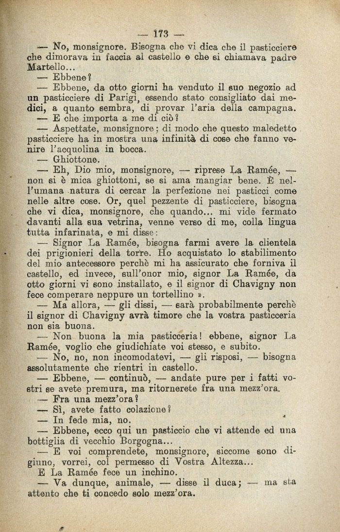 — Signor La Ramée, bisogna farmi avere la clientela dei prigionieri della torre. Ho acquistato lo stabilimento del mio antecessore perchè mi ha assicurato che forniva il castello, ed invece, sull'onor mio, signor La Ramée, da otto giorni vi sono .installato, e il signor di Chavigny non fece comperare neppure un tortellino ».