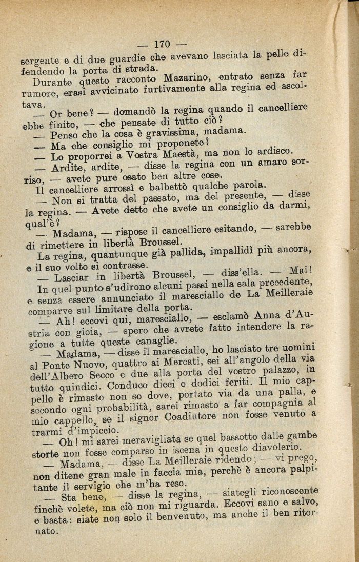 — Madama, —disse il maresciallo, ho lasciato tre uomini al Ponte Nuovo, quattro ai Mercati, sei all'angolo della via dell'Albero Secco e due alla porta del vostro palazzo, in tutto quindici. Conduco dieci o dodici feriti. Il mio cappello è rimasto non so dove, portato via da una palla, e secondo ogni probabilità, sarei rimasto a far compagnia al mio cappello, se il signor Coadiutore non fosse venuto a trarmi d'impiccio.