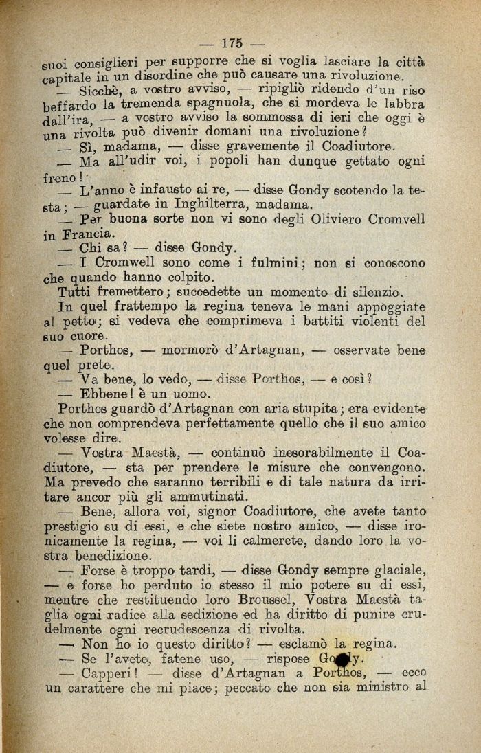 — Forse è troppo tardi, — disse Gondy sempre glaciale, — e forse ho perduto io stesso il mio potere su di essi, mentre che restituendo loro Broussel, Vostra Maestà taglia ogni radice alla sedizione ed ha diritto di punire crudelmente ogni recrudescenza di rivolta.