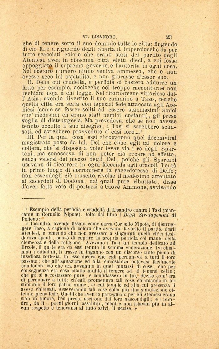 « Lisandro, avendo fissato, come narra Cornelio Nipote, di distruggete Taso, a cagione di coloro che avevano favorito il partito degli Ateniesi, e temendo che nnn avessero a sfuggirgli quelli ch'ci desiderava spenti; pensò di coprire la propria perfidia col manto della clemenza e della religione Avevano i Tasi un tempio dedicato ad Ercole, il quale era da essi tenuto in somma venerazione. Ivi chiamati i cittadini, li trasse in inganno con un discorsi! tutto pieno di insidiosa cortesia. In esso diceva che egli perdonava a lutti il loro passato ; che all'agitazione ed alla circostanza potevasi facilmente condonare ciò che era avvenuto in quel mutarsi di cose; che per conseguenza era cosa affatto inutile ti temere od il tenersi celati ; che gii si accostassero pure. e confidassero in lui, deciso com' era di perdonare a tutti; ch'eali prometteva tali cose, chiamando in testimoni il loro patrio nume, ai cui tempio ed alla cui presenza li aveva chiamati. Asseverando tali cose colla più fina simulazione ottenne piena fede. Quelli che aven lo parteggialo per gli Ateniesi erano stali in timore, ben presto usciiono dai loro nascondigli; e i isan-dro , da 11 : puchi giorni, assalitili, ment e non istavan più in alcun sospetto e tenevansi al tutto salvi, li uccise. »