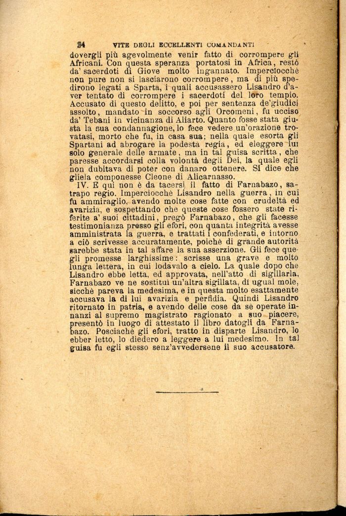 IV. E qui non è da tacersi il fatto di Farnabazo, satrapo regio. Imperciocché Lisandro nella guerra, in cui fu ammiraglio, avendo molte cose fatte con crudeltà ed avarizia, e sospettando che queste cose fossero state riferite a' suoi cittadini, pregò Farnabazo, che gli facesse testimonianza presso gli efori, con quanta integrità avesse amministrata la guerra, e trattati 1 confederati, e intorno a ciò scrivesse accuratamente, poiché di grande autorità sarebbe stata in tal affare la sua asserzione. Gli fece quegli promesse larghissime : scrisse una grave e molto lunga lettera, in cui lodavalo a cielo. La quale dopo che Lisandro ebbe letta, ed approvata, nell'atto di sigillarla, Farnabazo ve ne sostituì un'altra sigillata, di ugual mole, sicché pareva la medesima, e in questa molto esattamente accusava la di lui avarizia e perfidia. Quindi Lisandro ritornato in patria, e avendo delle cose da sé operate innanzi al supremo magistrato ragionato a suo piacere, presentò in luogo di attestato il libro datogli da Farnabazo. Posciachè gli efori, tratto in disparte Lisandro, lo ebber letto, lo diedero a leggere a lui medesimo. In tal guisa fu egli stesso senz'avvedersene il suo accusatore.