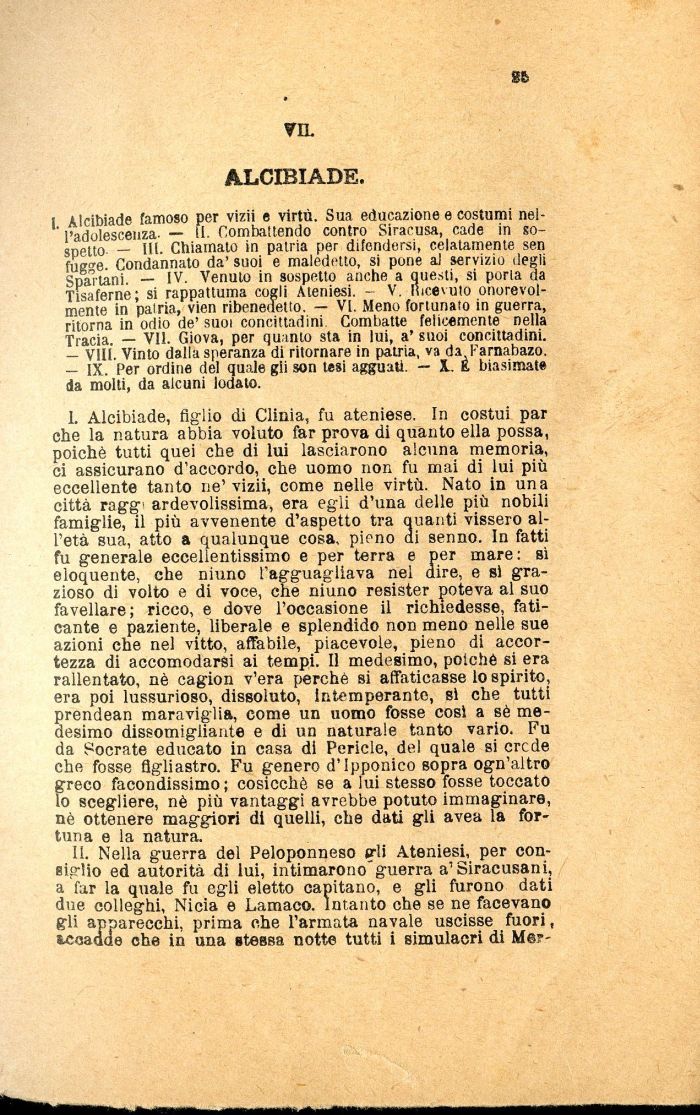 I Alcibiade famoso per vizii e virtù. Sua educazione e costumi nel-' l'adolescenza- — li. Combattendo contro Siracusa, cade in sospetto — III. Chiamato in patria per difendersi, celatamente sen fugge. Condannato da' suoi e maledetto, si pone al servizio degli Spartani. — IV. Venuto in sospetto anche a questi, si porla da Tisaferne; si rappattuma cogli Ateniesi. - V. Ricevuto onorevolmente in palria, vien ribenedetto. — Vi. Meno fortunato in guerra, ritorna in odio de'suoi concittadini. Combatte felicemente nella Tracia. — VII. Giova, per quanto sta in lui, a' suoi concittadini.