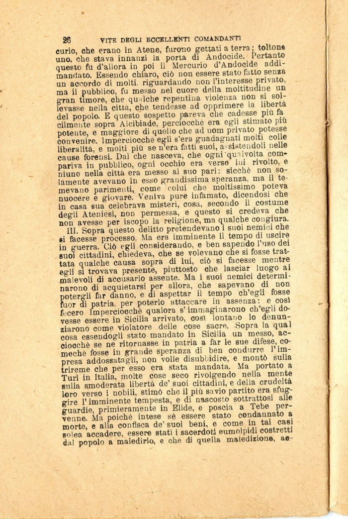 Ili. Sopra questo delitto pretendevano i suoi nemici che si facesse processo. Ma era imminente il tempo di uscire in guerra. Ciò egli considerando, e ben sapendo l'uso dei suoi cittadini, chiedeva, che se volevano che si fosse trattata qualche causa sopra di lui, ciò si facesse mentre egli si trovava presente, piuttosto che lasciar luogo ai malevoli di accusarlo assente. Ma i suoi nemici determinarono di acquietarsi per allora, che sapevano di non potergli far danno, e di aspettar il tempo ch'egli fosse fuor ai patria, per poterlo attaccare in assenza: e cosi fecero Imperciocché qualora s'immaginarono ch'egli dovesse essere in Sicilia arrivato, cosi lontano lo denunziarono come violatore delle cose sacre. -Sopra la qual cosa essendogli stato mandato in Sicilia un messo, acciocché se ne ritornasse in patria a far le sue difese, co-mechè fosse in grande speranza di ben condurre l'impresa addossatagli, non volle disubbidire, e montò sulla trireme che per esso era stata mandata. Ma portato a Turi in Italia, molte cose seco rivolgendo nella mente sulla smoderata libertà de' suoi cittadini, e della crudeltà loro verso i nobili, stimò che il più savio partito era sfuggire l'imminente tempesta, e di nascosto sottrattosi alle guardie, primieramente in Elide, e poscia a Tebe pervenne. Ma poiché intese sé essere stato condannato a morte, e alla confisca de' suoi beni, e. come in tai casi eolea accadere, essere stati i sacerdoti eumolpidi costretti dal popolo a maledirlo, e che di quella maledizione, ao-