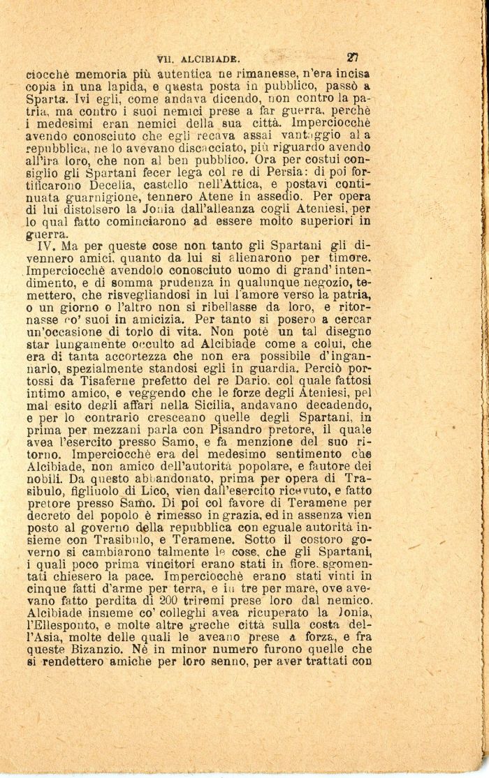 ciocché memoria più autentica ne rimanesse, n'era incisa copia in una lapida, e questa posta in pubblico, passò & Sparta. Ivi egli, come andava dicendo, non contro la patria. ma contro i suoi nemici prese a far guerra, perchè i medesimi eran nemici della sua città. Imperciocché avendo conosciuto che egli recava assai vantaggio al a repubblica, ne lo avevano discacciato, più riguardo avendo all'ira loro, che non al ben pubblico. Ora per costui consiglio gli Spartani fecer lega col re di Persia: di poi fortificarono Decelia, castello nell'Attica, e postavi continuata guarnigione, tennero Atene in assedio. Per opera di lui distolsero la Jonia dall'alleanza cogli Ateniesi, per lo qual fetto cominciarono ad essere molto superiori in guerra.