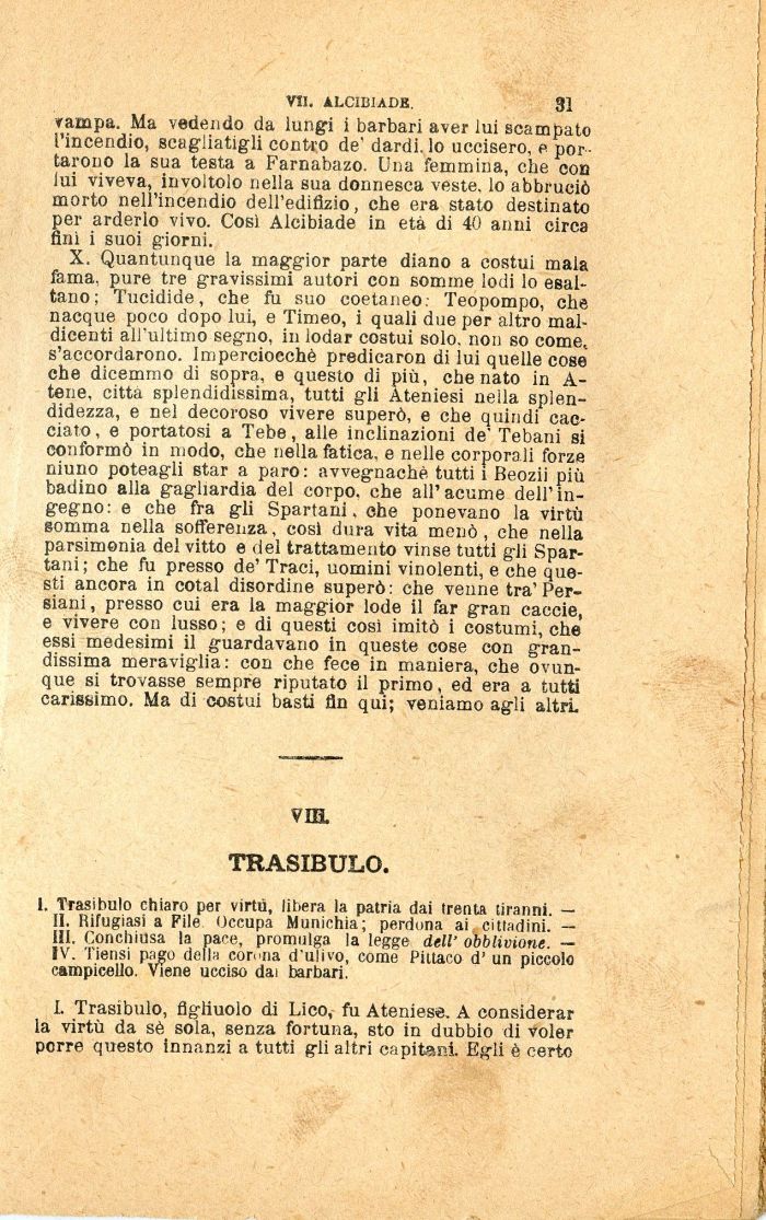 I. Trasibulo, figliuolo di Lieo, fu Ateniese. A considerar la virtù da sè sola, senza fortuna, sto in dubbio di voler porre questo innanzi a tutti gli altri capitani. Egli è certo
