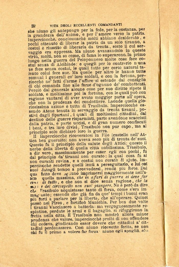 she uiuno gli antepongo per la fede, per la costanza, per la grandezza dell'animo, e per l'amore verso la patria. Imperciocché, conciossiachè molti abbiano desiderato , e pochi ottenuto di liberar la patria da un solo tiranno, a costui è riuscito di liberarla da trenta, sotto il cui servaggio era oppressa. Ma niuno avanzandolo in queste virtù, molti, non so come, di fama lo superarono. In primo luogo nella guerra del Peloponneso molte cose fece costui senza di Alcibiade: e quegli per lo contrario n una ne fece senza costui, le quali tutte per certo naturai talento colui fece sue. Ma quelle per altro le hanno tutte comuni i generali co' loro soldati, e con la fortuna, per-tiocchè ne' fatti d'arme l'affare si estende dal consiglio di chi comanda fino alle forze d'ognuno de' combattenti. Perciò dal generale alcune cose per suo diritto ripete il soldato, e moltissime poi la fortuna, con le quali può con ragione vantarsi di aver avuto maggior parte all' opera, che non la prudenza del condottiere. Laonde quella gloriosissima azione è tutta di Trasibulo. Imperciocché essendo Atene tenuta in servaggio da trenta tiranni, postivi dagli Spartani, i quali di moltissimi cittadini, dal destino delle guerre risparmiati, parte avendone scacciati dalla patria, e parte uccisi, e di gran numero confiscati i beni, e tra loro divisi, Trasibulo non pur capo, ma a! principio solo dichiarò loro la guerra.