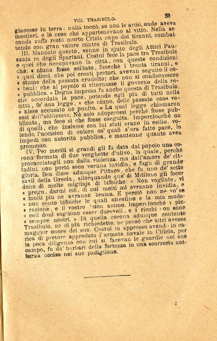 giacesse in terra ; nulla toccò, se non le armi, onde aveva mestieri, e le cose che appartenevano al vitto. Nella se conda zuffa restò morto Crizia capo dei tiranni, combattendo con gran valore contro di Trasibulo.