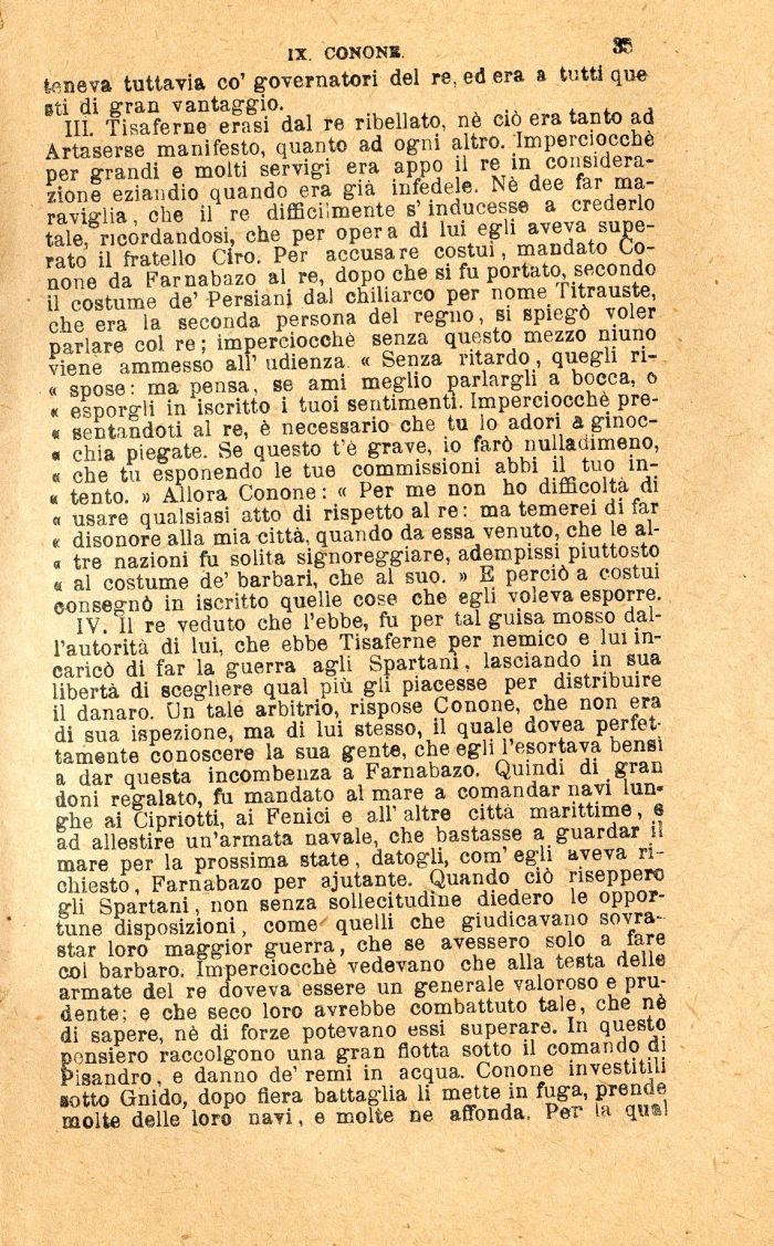 III. Tisaferne erasi dal re ribellato, nè ciò era tanto ad Artaserse manifesto, quanto ad ogni altro. Imperciocché per grandi e molti servigi era appo il re in considerazione eziandio quando era già infedele. Nè dee far maraviglia, che il re difficilmente s'inducesse a crederlo tale, ricordandosi, che per opera di lui egli aveva superato il fratello Ciro. Per accusare costui, mandato Co-none da Farnabazo al re, dopo che si fu portato, secondo il costume de' Persiani dal chiliarco per nome Titrauste, che era la seconda persona del regno, si spiegò voler parlare col re ; imperciocché senza questo mezzo niuno viene ammesso all' udienza « Senza ritardo, quegli ri-« spose: ma pensa, se ami meglio parlargli a bocca, o « esporgli in iscritto i tuoi sentimenti. Imperciocché pro-fi sentandoti al re, è necessario che tu lo adori a ginoc-« chia piegate. Se questo t'è grave, io farò nulladimeno, a che tu esponendo le tue commissioni abbi il tuo in-« tento. » Allora Conone : « Per me non ho difficoltà di a usare qualsiasi atto di rispetto al re: ma temerei di far e disonore alla mia città, quando da essa venuto, che le al-o tre nazioni fu solita signoreggiare, adempissi piuttosto fi al costume de' barbari, che al suo. » E perciò a costui consegnò in iscritto quelle cose che egli voleva esporre.