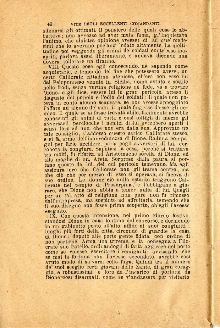IX. Con questa intenzione, nel primo giorno festivo, standosi Dione in casa lontano dal concorso, e dormendo In un gabinetto posto all'alto, affidò ai suoi congiunti i luoghi più forti della città, circondò di guardie la casa di. Dione : deputò alle porte gente fidata, con ordine di non partirne. Arma una trireme, e la consegna a Filo-crate suo fratello, ordinandogli di farla aggirare nel porto come se volesse esercitare i remiganti: avvisando, che se mai la fortuna non l'avesse secondato, avrebbe così avuto modo di salvarsi colla fuga. Quindi tra il numero de' suoi sceglie certi giovani dello Zante, di gran coraggio, e robustissimi, e loro da l'incarico di portarsi da Òione così disarmati, come se v'andassero per visitarlo