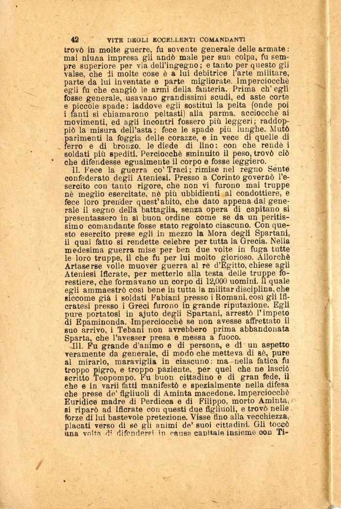 trovò in molte guerre, fu sovente generale delle armate : mai niuna impresa gli andò male per sua colpa, fu sempre superiore per via dell'ingegno; e tanto per questo gli valse, che ii molte cose è a lui debitrice l'arte militare, parte da lui inventate e parte migliorate. Imperciocché egli fu che cangiò le armi della fanteria. Prima eh' egli fosse generale, usavano grandissimi scudi, ed aste corte e piccole spade: laddove egli sostituì la pelta (onde poi i fanti si chiamarono peltasti) alla parma, acciocché ai movimenti, ed agli incontri fossero più leggeri; raddoppiò la misura dell'asta; fece le spade più lunghe. Mutò parimenti la foggia delle corazze, e in vece di quelle di ferro e di bronzo, le diede di lino: con che rendè i soldati più spediti. Perciocché sminuito il peso, trovò ciò che difendesse egualmente il corpo e fosse leggiero.