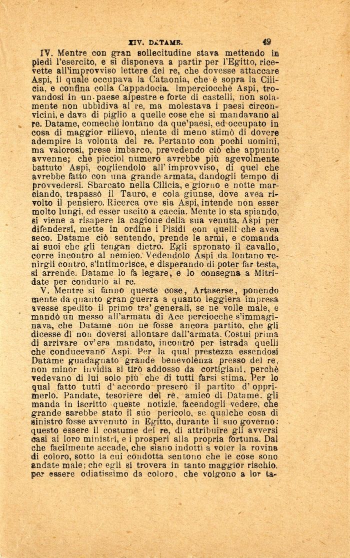V. Mentre si fanno queste cose, Artaserse, ponendo mente da quanto gran guerra a quanto leggiera impresa ivesse spedito il primo tra' generali, se ne volle male, e mandò un messo all'armata di Ace perciocché s'immaginava, che Datarne non ne fosse ancora partito, che gli dicesse di non doversi allontare dall'armata. Costui prima di arrivare ov'era mandato, incontrò per istrada quelli che conducevano Aspi. Per la qua! prestezza essendosi Datarne guadagnato grande benevolenza presso del re, non minor invidia si tirò addosso da cortigiani, perchè vedevano di lui solo più che di tutti farsi stima. Per lo qual fatto tutti d' accordo presero il partito d'opprimerlo. Pandate, tesoriere del re. amico di Datarne, gli manda in iscritto queste notizie, facendogli vedere, che grande sarebbe stato il suo pericolo, se qualche cosa di sinistro fosse avvenuto in Egitto, durante il suo governo : questo essere il costume dei re, di attribuire gli avversi «sasi ai loro ministri, e i prosperi alla propria fortuna. Dal che facilmente accade, che siano indotti a voler la rovina di coloro, sotto la cui condotta sentono che le cose sono andate male; che egli si troverà in tanto maggior rischio, pe» essere odiatissimo da coloro, che volgono a lor ta-