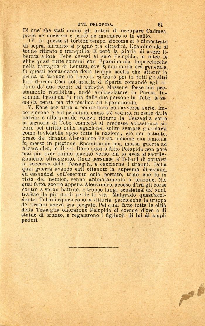 V. Ebbe per altro a combattere coli'avversa sorte. Im-perciocche e sul principio, come s'è veduto, fu esule dalla patria; e allorquando voleva ridurre la Tessaglia sotto la sig'noria di Tebe, comechè si credesse abbastanza sicuro pei diritto della legazione, solito sempre guardarsi come inviolabile appo tutte le nazioni, ciò non ostante, preso dal tiranno Alessandro Fereo, insieme con ismenia fu messo in prigione. Epaminonda poi, mossa guerra ad Alessandro, lo liberò. Dopo questo fatto Pelopida non potè mai più aver animo placato verso chi lo avea sì sacrilegamente oltraggiato. Onde persuase a'Tebani di portarsi in soccorso della Tessaglia, e cacciarne i tiranni. Della qual guerra avendo egli ottenuto la suprema direzione, ed essendosi coll'esercito cola portato, tosto che fu in vista del nemico, venne animosamente a tenzone. Nel qual fatto, scorto appena Alessandro, acceso d'ira gli corse contro a spron battuto, e troppo lungi scostatosi da' suoi, trafitto da più dardi perdè la vita. Malgrado quest'accidente i Tebani riportarono la vittoria. perciocché la truppa de' tiranni aveva già piegato. Pel qual fatto tutte le città della Tessaglia onorarono Pelopida di corone d'oro e di statue di bronzo, e regalarono i figliuoli di lui di ampii poderi.