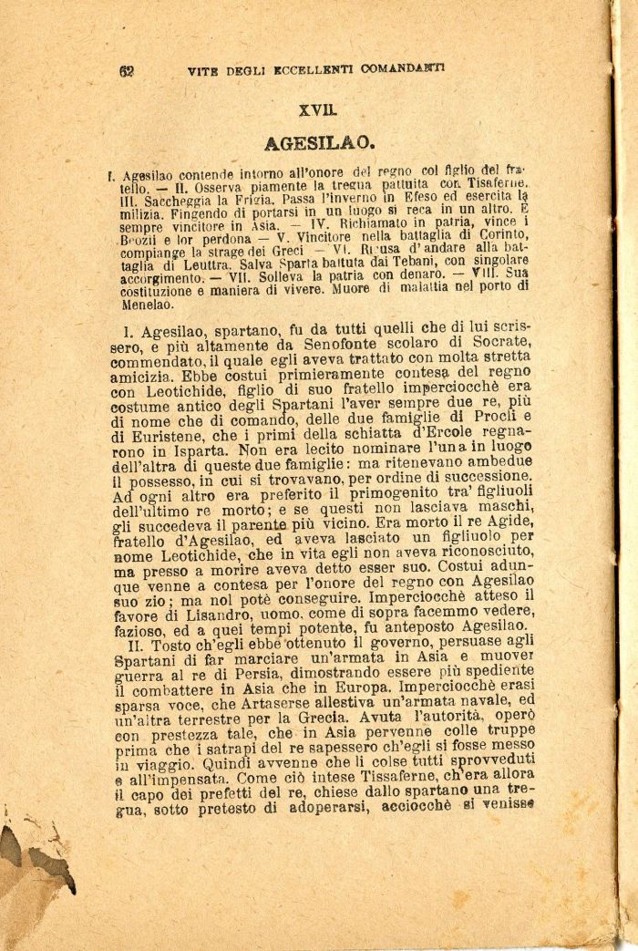 I. Agesilao, spartano, fu da tutti quelli che di lui scrissero, e più altamente da Senofonte scolaro di Socrate, commendato, il quale egli aveva trattato con molta stretta amicizia. Ebbe costui primieramente contesa del regno con Leotichide, figlio di suo fratello imperciocché era costume antico degli Spartani l'aver sempre due re, più di nome che di comando, delle due famiglie di Prodi e di Euristene, che i primi della schiatta d'Ercole regnarono in Isparta. Non era lecito nominare l'una in luogo dell'altra di queste due famiglie : ma ritenevano ambedue il possesso, in cui si trovavano, per ordine di successione. Ad ogni altro era preferito il primogenito tra' figliuoli dell'ultimo re morto; e se questi non lasciava maschi, gli succedeva il parente più vicino. Era morto il re Agide, fratello d'Agesilao, ed aveva lasciato un figliuolo per nome Leotichide, che in vita egli non aveva riconosciuto, ma presso a morire aveva detto esser suo. Costui adunque venne a contesa per l'onore del regno con Agesilao suo zio ; ma noi potè conseguire. Imperciocché atteso il favore di Lisandro, uomo, come di sopra facemmo vedere, fazioso, ed a quei tempi potente, fu anteposto Agesilao.