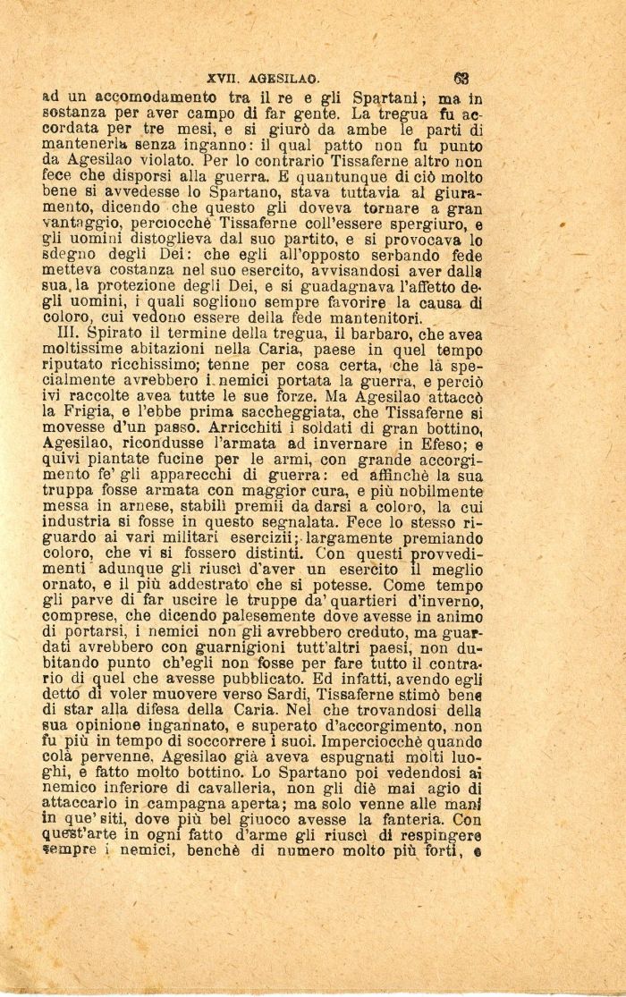 III. Spirato il termine della tregua, il barbaro, che avea moltissime abitazioni nella Caria, paese in quel tempo riputato ricchissimo; tenne per cosa certa, che là specialmente avrebbero i nemici portata la guerra, e perciò ivi raccolte avea tutte le sue forze. Ma Agesilao attaccò la Frigia, e l'ebbe prima saccheggiata, che Tissaferne si movesse d'un passo. Arricchiti i soldati di gran bottino, Agesilao, ricondusse l'armata ad invernare in Efeso; e quivi piantate fucine per le armi, con grande accorgimento fe'gli apparecchi di guerra: ed affinchè la sua truppa fosse armata con maggior cura, e più nobilmente messa in arnese, stabilì premii da darsi a coloro, la cui industria si fosse in questo segnalata. Fece lo stesso riguardo ai vari militari esercizii; largamente premiando coloro, che vi si fossero distinti. Con questi provvedimenti adunque gli riuscì d'aver un esercito il meglio ornato, e il più addestrato che si potesse. Come tempo gli parve di far uscire le truppe da' quartieri d'inverno, comprese, che dicendo palesemente dove avesse in animo di portarsi, i nemici non gli avrebbero creduto, ma guardati avrebbero con guarnigioni tutt'altri paesi, non dubitando punto ch'egli non fosse per fare tutto il contrario di quel che avesse pubblicato. Ed infatti, avendo egli detto di voler muovere verso Sardi, Tissaferne stimò ben« di star alla difesa della Caria. Nel che trovandosi della sua opinione ingannato, e superato d'accorgimento, non fu più in tempo di soccorrere i suoi. Imperciocché quando colà pervenne, Agesilao già aveva espugnati molti luoghi, e fatto molto bottino. Lo Spartano poi vedendosi ai nemico inferiore di cavalleria, non gli diè mai agio di attaccarlo in campagna aperta; ma solo venne alle mani in que' siti, dove più bel giuoco avesse la fanteria. Con quest'arte in ogni fatto d'arme gli riuscì di respingere sempre i nemici, benché di numero molto più forti, e