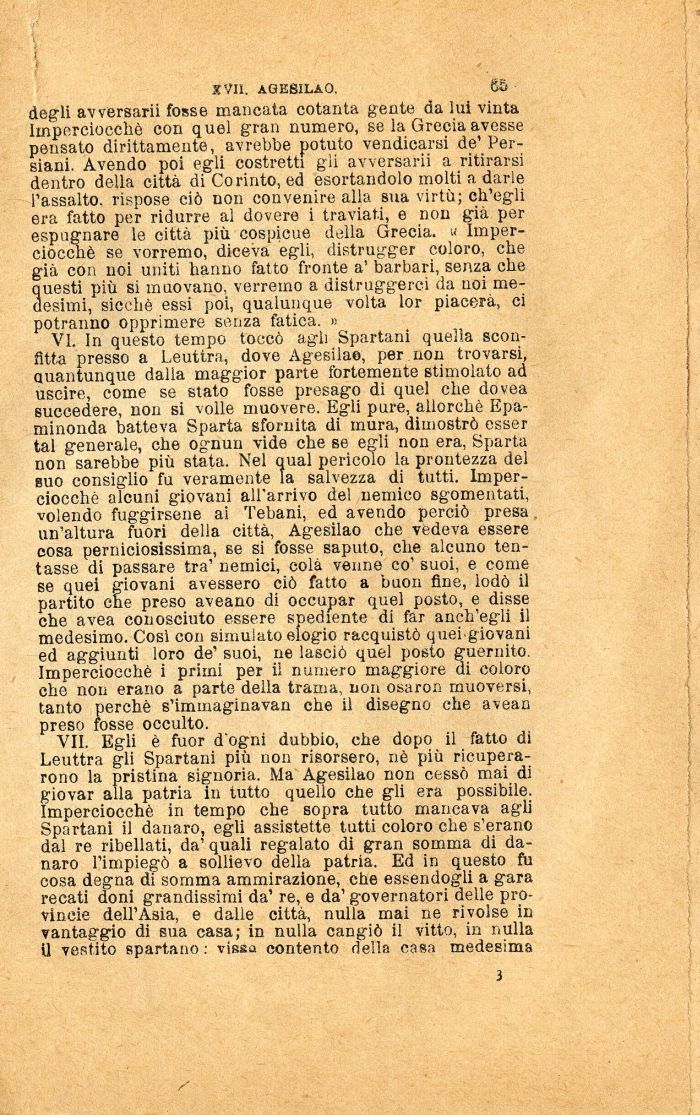 VI. In questo tempo toccò agli Spartani quella sconfìtta presso a Leuttra, dove Agesilao, per non trovarsi, Quantunque dalla maggior parte fortemente stimolato ad uscire, come se stato fosse presago di quel che dovea succedere, non si volle muovere. Egli pure, allorché Epaminonda batteva Sparta sfornita di mura, dimostrò esser tal generale, che ognun vide che se egli non era, Sparta non sarebbe più stata. Nel qual pericolo la prontezza del suo consiglio fu veramente la salvezza di tutti. Imperciocché alcuni giovani all'arrivo del nemico sgomentati, volendo fuggirsene ai Tebani, ed avendo perciò presa un'altura fuori della città, Agesilao che vedeva essere cosa perniciosissima, se si fosse saputo, che alcuno tentasse di passare tra' nemici, colà venne co' suoi, e come se quei giovani avessero ciò fatto a buon fine, lodò il partito che preso aveano di occupar quel posto, e disse che avea conosciuto essere spediente di far anch'egli il medesimo. Cosi con simulato elogio racquistò quei giovani ed aggiunti loro de' suoi, ne lasciò quel posto guernito. Imperciocché i primi per ii numero maggiore di coloro che non erano a parte della trama, non osaron muoversi, tanto perché s'immaginavan che il disegno che avean preso fosse occulto.