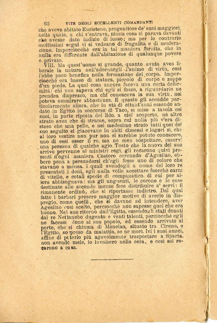 Vili. Ma quest'uomo sì grande, quanto avuta avea liberale la natura Dell'adornargli l'animo di virtù, così l'ebbe poco benefica nella formazione del corpo. Imperciocché era basso di statura, piccolo di corpo e zoppo d'un piede. La qual cosa ancora faceva una certa deformità: chi non sapeva chi egli si fosse, a riguardarlo ne prendea disprezzo, ma chi conosceva la sua virtù, noi poteva ammirare abbastanza. E questo gli accadde particolarmente allora, che in età di ottant'anni essendo andato in Eg-itto in soccorso di 'Paco, si mise a tavola coi suoi, in parte riposta del lido, a eie) scoperto, nè altro strato avea che di strame, sopra cui nulla più v'era disteso che una pelle, e nel medesimo strato tutti quei de? suo seguito si giacevano in abiti dimessi e logori si, che al loro vestire non pur non si sarebbe potuto conoscere, uno di essi esser il re, ma nè men sospettare, esservr una persona di qualche agio. Tosto che la nuova del suo arrivo pervenne ai ministri regi, gli recarono quivi presenti d'ogni maniera. Costoro cercando d'Agesilao, ebbero pena a persuadersi ch'egli fosse uno di coloro che stavano a mensa. 1 quali avendogli a nome del loro re presentati i doni, egli nulla volle accettare fuorché carni di vitello, e cotali specie di companatico, di cui per allora abbisognava : ma gli unguenti, le corone e le cose destinate alle seconde mense fece distribuire a' servi : il rimanente ordinò, che sì riportasse indietro. Dal qua! fatto i barbari presero maggior motivo di averlo in dispregio, come quelli, che si davano ad intendere, aver Agesilao così scelto, perciocché non sapesse quel che era buono. Nel suo ritorno dall'Egitto, essendogli stati donati dal re Nettanebo dugento e venti talenti, perciocché egli ne facesse dono al suo popolo, ed essendo arrivato al porto, che si chiama di Menelao, situato tra Cirene, e l'Egitto, so rprcso da malattia, se ne morì. Ivi i suoi amici, affine di poterlo più agevolmente trasportare a Sparta, non avendo mele, lo involsero nella cera, e cosi sei recarono a casa.