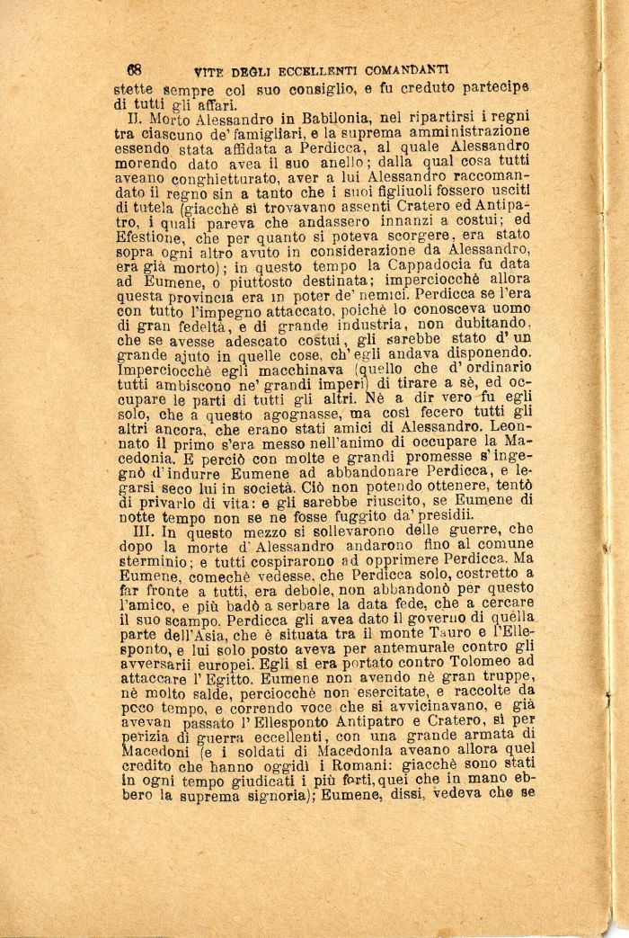 DI. In questo mezzo si sollevarono delle guerre, che dopo la morte d' Alessandro andarono fino al comune sterminio; e tutti cospirarono ad opprimere Perdicca. Ma Eumene, comechè vedesse, che Perdicca solo, costretto a far fronte a tutti, era debole, non abbandonò per questo l'amico, e più badò a serbare la data fede, che a cercare il suo scampo. Perdicca gli avea dato il governo di quella parte dell'Asia, che è situata tra il monte Tauro e l'Ellesponto, e lui solo posto aveva per antemurale contro gli avversarii europei. Egli si era portato contro Tolomeo ad attaccare l'Egitto. Eumene non avendo nè gran truppe, nè molto salde, perciocché non esercitate, e raccolte da poco tempo, e correndo voce che si avvicinavano, e già avevan passato l'Ellesponto Antipatro e Cratero, sì per perizia di guerra eccellenti, con una grande armata di Macedoni (e i soldati di Macedonia aveano allora quel credito che ha,nno oggidì i Romani: giacché sono stati in ogni tempo giudicati i più forti,quei che in mano ebbero la suprema signoria); Eumene, dissi, vedeva che se
