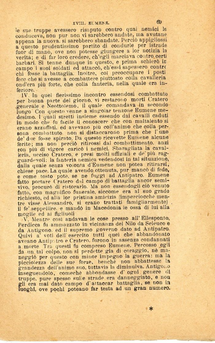 IV. In quel flerissimo incontro essendosi combattuto per bnona parte del giorno, vi restarono morti Cratero generale e Neottnlemo, il quale comandava in secondo luogo Con questo venne a singoiar tenzone Eumene medesimo. 1 quali stretti insieme essendo dai cavalli caduti in modo che fu facile il conoscere che con maltalento si erano azzuffati, ed avevano più coll'animo ohe colla persona combattuto non si distaccarono prima che l'uno de' due fosse spirato. Da questo ricevette Eumene alcune ferite; ma non perciò ritirossi dal combattimento, anzi con più di vigore caricò i nemici. Sbaragliata la cavalleria, ucciso Cratero. e presi molti uffiziali e de'più ragguardevoli; la fanteria nemica vedendosi in tal situazione, dalla quale senza voionta d'Eumene non potea ritirarsi, chiese pace. La quale avendo ottenuta, pur mancò di fede, e come tosto potè, se ne fuggi ad Aritipatro. Eumene fatto portare Cratero dal campo di battaglia ancor semivivo, procurò di ristorarlo. Ma non essendogli ciò venuto fatto, con magnifico funerale, siccóme era al suo grado richiesto, ed alla lor pristina amicizia (imperciocché mentre visse Alessandro, si erano trattati famigliarmente) il fe' seppellire, e mandò in Macedonia le ossa di lui alla moglie ed ai figliuoli