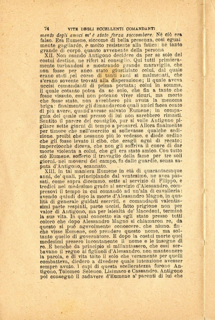 XIII. in tal maniera Eumene in età di quarantacinque anni, de' quali, principiando dal ventesimo, ne avea passati, come sopra dicemmo, sette al servizio di Filippo, e tredici nel medesimo grado al servizio d'Alessandro, compresovi il tempo in cui comandò ad un'ala di cavalleria : avendo quindi dopo la morte d'Alessandro Magno, in qualità di generale guidati eserciti, e comandanti valentissimi parte respinti, parte uccisi, fatto prigione non per valor di Antigono, ma per islealtà de' Macedoni, terminò la sua vita. In qual concetto sia egli stato presso tutti coloro che dopo Alessandro Magno si chiamaron re, da questo si può agevolmente conoscere, che niuno. finché visse Eumene, osò prendere questo nome, ma soltanto quello di governatore. E dopo la costui morte quei medesimi presero incontanente il nome e le insegne di re. E benché da principio si millantassero, che essi serbavano il regno ai figliuoli d'Alessandro, non mantennero la parola, e di vita tolto il solo che veramente per quelli combatteva, diedero a divedere quale intenzione avesser sempre, avuto. 1 capi di questa scelleratezza furono Antigono, Tolomeo Seleuco. Lisimaco e Cassandro. Antigono poi consegnò il aadavere d'Eumene a' parenti di lui che