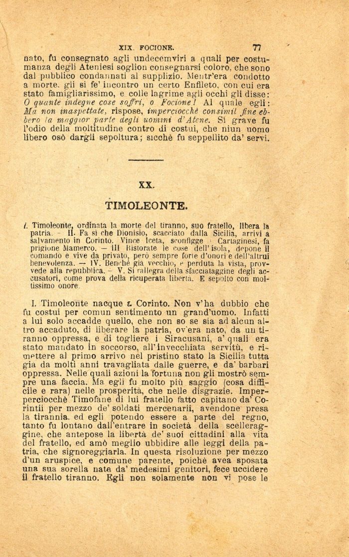 I. Timoleonte, ordinata la morte del tiranno, suo fratello, libera la patria. II. Fa sì ohe Dionisio, scacciato dalla Sicilia, arrivi a salvamento in Corinto. Vince Iceia, sconfigge Cartaginesi, fa prigione Mamerco. — III Kistorate le cose dell'isola, depone il comando e vive da privato, però sempre fone d'onori e dell'altrui benevolenza. -- IV. Benché già vecchio, e perduta la vista, provvede alla repubblica. - V. Si rallegra della sfacciataggine degli accusatori, come prova della ricuperata libertà. E sepolto con moltissimo onore.