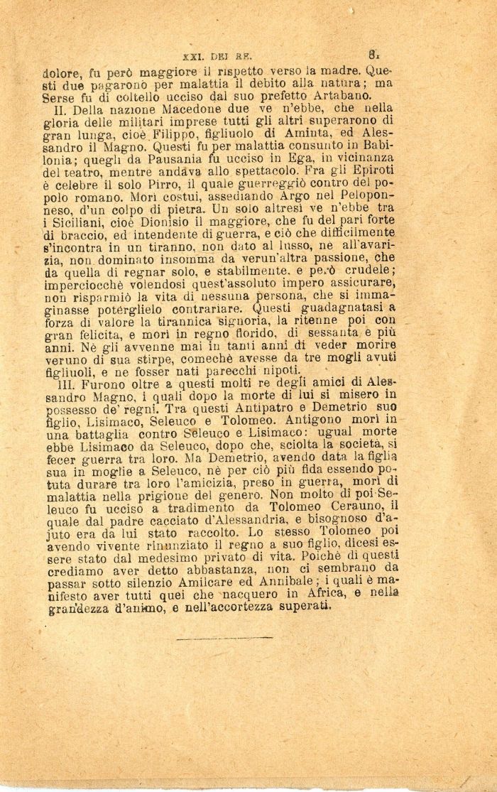 II. Della nazione Macedone due ve n'ebbe, che nella gloria delle militari imprese tutti gli altri superarono di gran lunga, cioè.Filippo, figliuolo di Aminta, ed Alessandro il Magno. Questi fu per malattia consunto in Babilonia; quegli da Pausania fu ucciso in Ega, in vicinanza del teatro, mentre andava allo spettacolo. Fra gli Epiroti è celebre il solo Pirro, il quale guerreggiò contro del popolo romano. Mori costui, assediando Argo nel Peloponneso, d'un colpo di pietra. Un solo altresì ve n'ebbe tra i Siciliani, cioè Dionisio il maggiore, che fu del pari forte di braccio, ed intendente di guerra, e ciò che difficilmente s'incontra in un tiranno, non dato al lusso, né all'avarizia, non dominato insomma da verun'altra passione, che da quella di regnar solo, e stabilmente, e pe.'ò crudele; imperciocché volendosi quest'assoluto impero assicurare, non risparmiò la vita di nessuna persona, che si immaginasse potérglielo contrariare. Questi guadagnatasi a forza di valore la tirannica signoria, la ritenne poi con gran felicita, e morì in regno florido, di sessanta e più anni. Nè gli avvenne mai in tanti anni di veder morire veruno di sua stirpe, comechè avesse da tre mogli avuti figliuoli, e ne fosser nati parecchi nipoti.