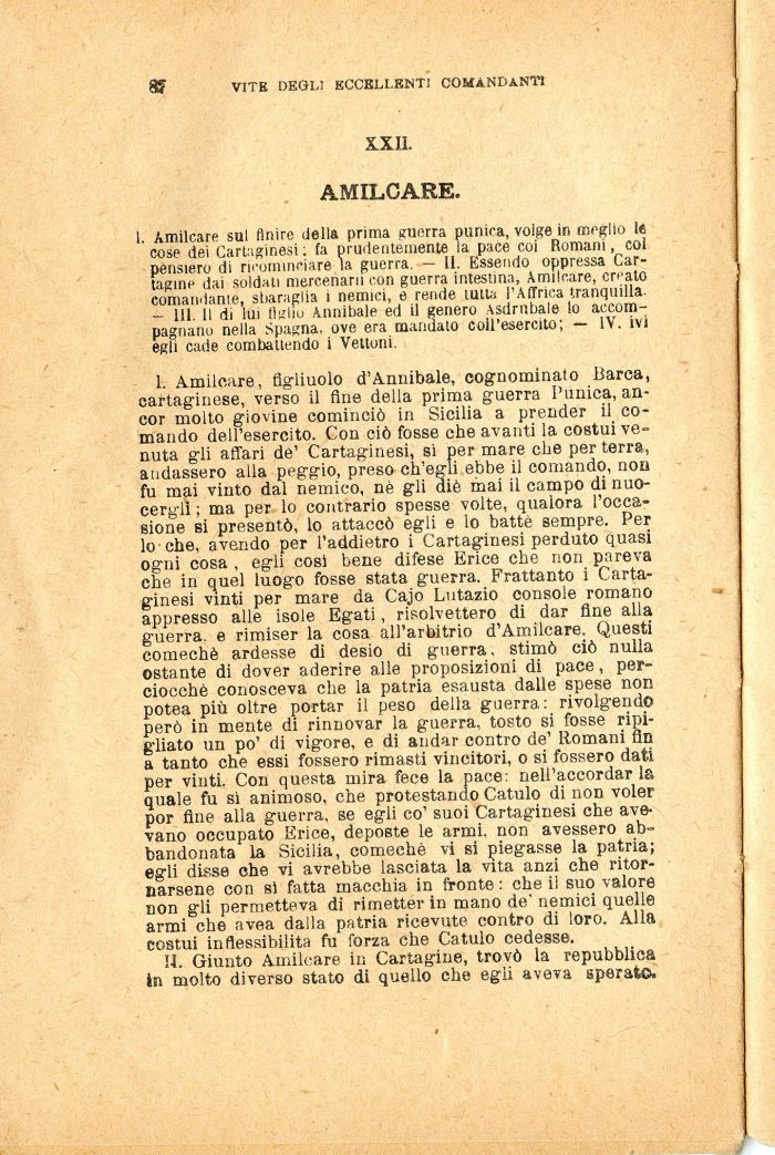 1. Amilcare sul finire della prima guerra punica, volge in meglio le cose dei Cartaginesi ; fa prudentemente la pace coi Romani, col pensiero di ricominciare la guerra. — II. Essendo oppressa Cartagine dai soldati mercenari! con guerra intestina, Amilcare, creato comandarne, sbaraglia 1 nemici, e rende lutti l'Affrica tranquilla, - 111. Il di lui figlio Annibale ed il genero Asdrubale lo accompagnano nella Spagna, ove era mandato eoll'esercito; — IV. ivi egli cade combattendo i Vettoni.