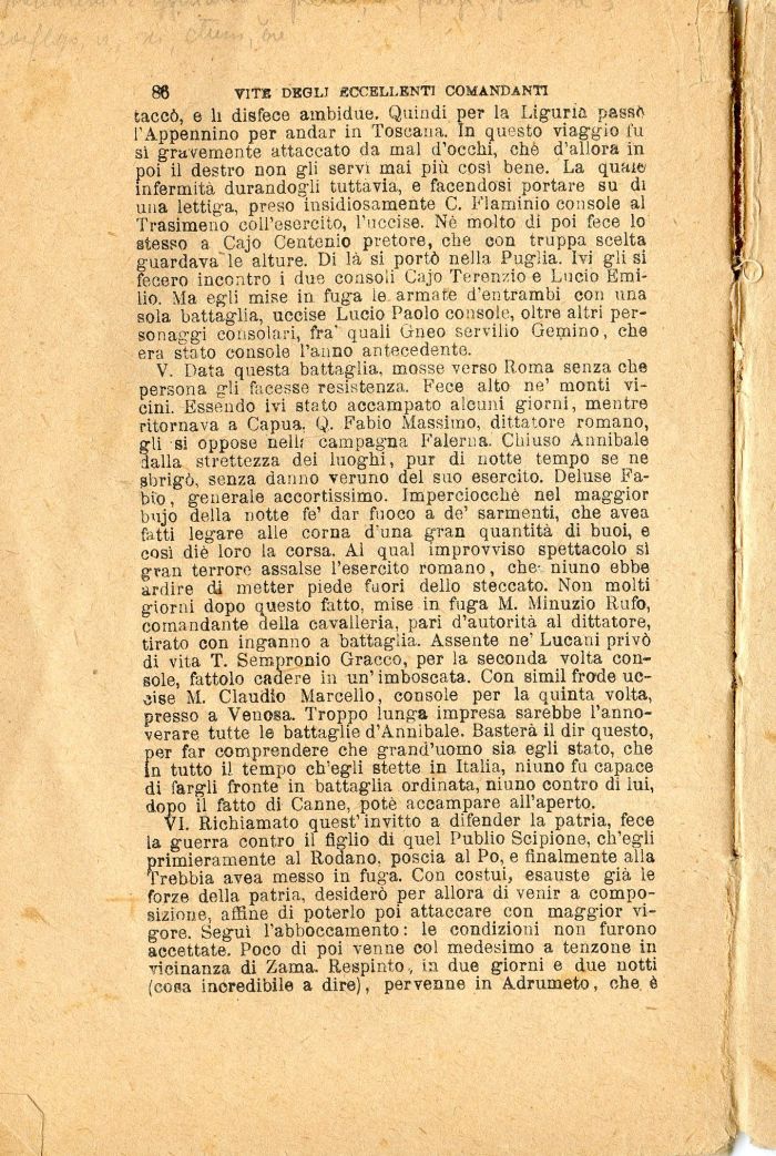 V. Data questa battaglia, mosse verso Roma senza che persona gli facesse resistenza. Fece alto ne' monti vicini. Essendo ivi stato accampato alcuni giorni, mentre ritornava a Capua. Q. Fabio Massimo, dittatore romano, gli si oppose nelh campagna Falerna. Chiuso Annibale dalla strettezza dei luoghi, pur di notte tempo se ne .sbrigò, senza danno veruno del suo esercito. Deluse Fabio , generale accortissimo. Imperciocché nel maggior bujo della notte fé' dar fuoco a de' sarmenti, che avea fatti legare alle corna d'una jyran quantità di buoi, e cosi diè loro la corsa. Al qual improvviso spettacolo si gran terrore assalse l'esercito romano, che- niuno ebbe ardire di metter piede fuori dello steccato. Noii molti giorni dopo questo fatto, mise in fuga M. Minuzio Rufo, comandante della cavalleria, pari d'autorità al dittatore, tirato con inganno a battaglia. Assente ne' Lucani privò di vita T. Sempronio Gracco, per la seconda volta 'console, fattolo cadere in un' imboscata. Con simil frode uccise M. Claudio Marcello, console per la quinta volta, presso a Venosa. Troppo lunga impresa sarebbe l'annoverare tutte le battaglie d'Annibale. Basterà il dir questo, per far comprendere che grand'uoino sia egli stato, che in tutto il tempo ch'egli stette in Italia, niuno fu capace di fargli fronte in battaglia ordinata, niuno contro di lui, dopo il fatto di Canne, potè accampare all'aperto.
