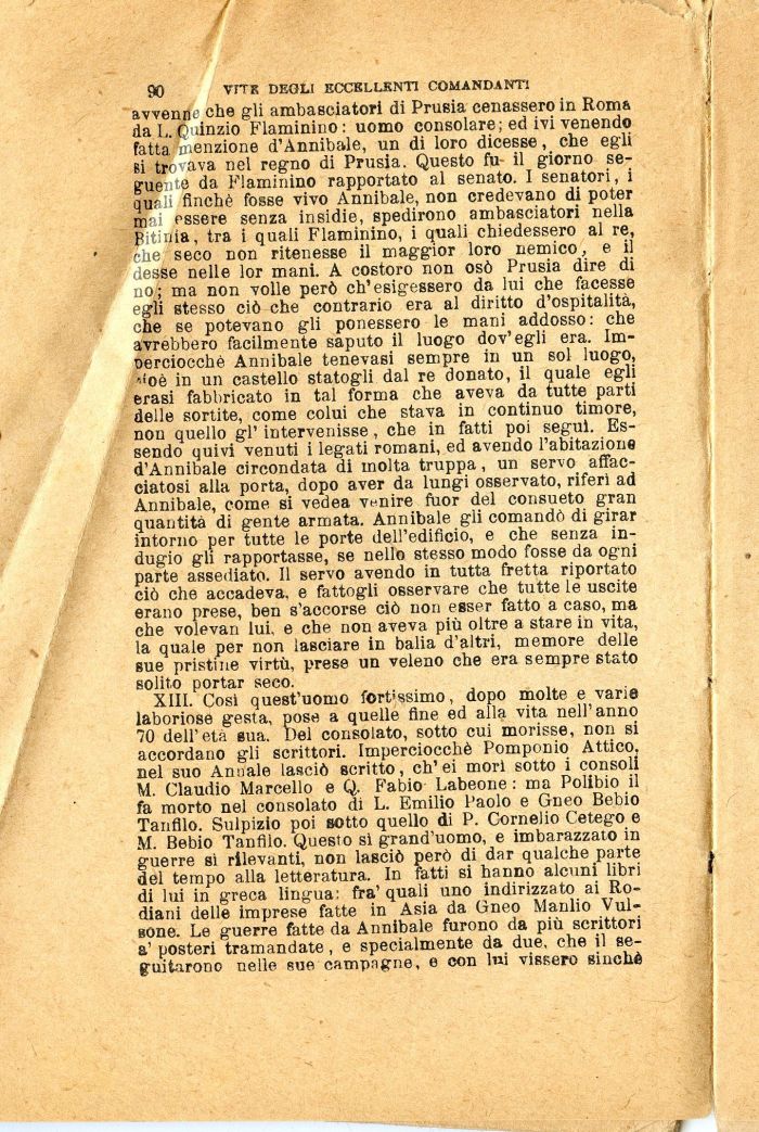 XIII. Cosi quest'uomo fortissimo, dopo molte e vari® laboriose gesta, pose a quelle fine ed alla vita nell'anno 70 dell'età sua. Del consolato, sotto cui morisse, non si accordano gli scrittori. Imperciocché Pomponio Attico, nel suo Annale lasciò scritto, ch'ei mori sotto i consoli M. Claudio Marcello e Q. Fabio Labeone : ma Polibio il fa morto nel consolato di L. Emilio Paolo e Gneo Bebio Tanfilo. Sulpizio poi sotto quello di P. Cornelio Cetego e M. Bebio Tanfilo. Questo si grand'uomo, e imbarazzato in guerre si rilevanti, non lasciò però di dar qualche parte del tempo alla letteratura. In fatti si hanno alcuni libri di lui in greca lingua: fra'quali uno indirizzato ai Ro-diani delle imprese fatte in Asia da Gneo Manlio Vul-sone. Le guerre fatte da Annibale furono da più scrittori a' posteri tramandate, e specialmente da due, che il seguitarono nelle sue campagne, e con lui vissero sinché
