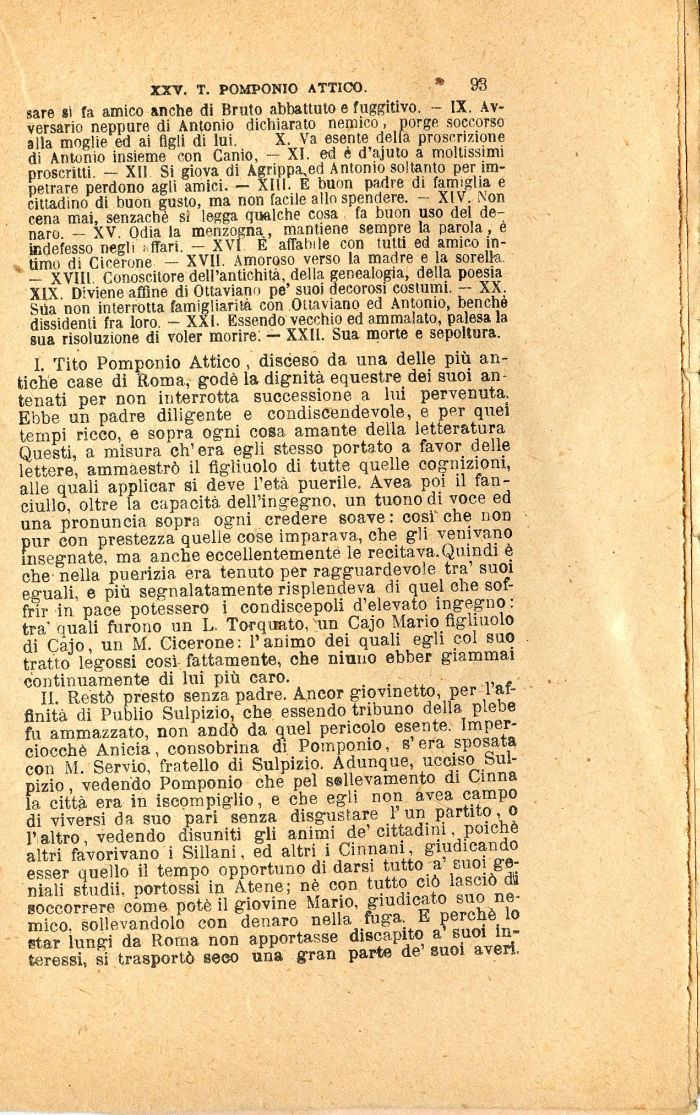 sare si fa amico anche di Bruto abbattuto e fuggitivo. - IX. Avversario neppure di Antonio dichiarato nemico, porge soccorso alla moglie ed ai figli di lui. X. Va esente della proscrizione di Antonio insieme con Canio, — XI. ed è d'ajuto a moltissimi proscritti. — XII Si giova di Agrippa,ed Antonio soltanto per impetrare perdono agli amici. — XIII. E buon padre di famiglia e cittadino di buon gusto, ma non facile allo spendere. — XIV. Non cena mai, senzachè si legga qualche cosa fa buon uso dei denaro. — XV. Odia la menzogna, mantiene sempre la parola , è indefesso negli : fTari. — XVI É affabile con tutti ed amico in-.. timo di Cicerone — XVII. Amoroso verso la madre e la sorella — XVIII, Conoscitore dell'antichità, della genealogia, della poesìa XIX. Diviene affine di Ottaviano pe' suoi decorosi costumi. — XX. SUa non interrotta famigliarità con Ottaviano ed Antonio, benché dissidenti fra loro. — XXI. Essendo vecchio ed ammalato, palesala sua risoluzione di voler morire: — XXII. Sua morte e sepoltura.