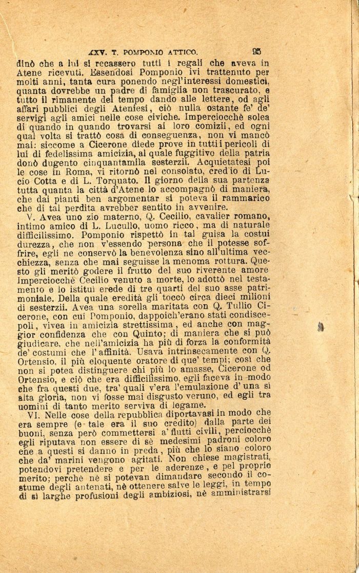 V. Avea uno zio materno, Q. Cecilio, cavalier romano, intimo amico di L. Luculio, uomo ricco, ma di naturale difficilissimo. Pomponio rispettò in tal guisa la costui durezza, che non v'essendo persona che il potesse soffrire, egli ne conservò la benevolenza sino all'ultima vecchiezza, senza che mai seguisse la menoma rottura. Questo gli meritò godere il frutto del suo riverente amore Imperciocché Cecilio venuto a morte, lo adottò nel testamento e lo istituì erede di tre quarti del suo asse patrimoniale. Della quale eredità gli toccò circa dieci milioni di sesterzii. Avea una sorella maritata con Q. Tullio Cicerone, con cui Pomponio, dappoich'erano stati condiscepoli , vivea in amicizia strettissima, ed anche con maggior confidenza che con Quinto; di maniera che si può giudicare, che nell'amicizia ha più di forza la conformità de' costumi che l'affinità. Usava intrinsecamente con Q. Ortensio, il più eloquente oratore di que' tempi; cosi che non si potea distinguere chi più lo amasse, Cicerone od Ortensio, e ciò che era difficilissimo, egli faceva in modo che fra questi due, tra' quali v'era l'emulazione d' una si alta gloria, non vi fosse mai disgusto veruno, ed egli tra uomini di tanto merito serviva di legame.