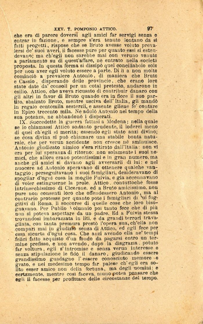 che era di parere doversi agli amici far servigi senza o entrar in fazione, e sempre s'era tenuto lontano da sì fatti progetti, rispose che se Bruto avesse voluto prevalersi de' suoi averi, il facesse pure per quanto essi si estendevano; ma ch'egli non sarebbe mai con veruno venuto a parlamento su di quest'affare, nè entrato nella società proposta. In questa forma si dissipò quel conciliabolo solo per non aver egli voluto essere a parte. Di 11 a non molto cominciò a prevalere Antonio, di maniera che Bruto e Cassio, disperando deile Provincie, che erano loro state date da' consoli per un cotaì pretesto, andarono in esilio. Attico, che aveva ricusato di contribuir danaro con gli altri in favor di Bruto quando era in flore il suo partito, sbalzato Bruto, mentre usciva deli' Italia, gli mandò in regalo centomila sesterzii, e assente gliene fe' contare in Epiro trecento mila. Nè adulò Ant/.mio nel tempo della sua potenza, nè abbandonò i disperati.