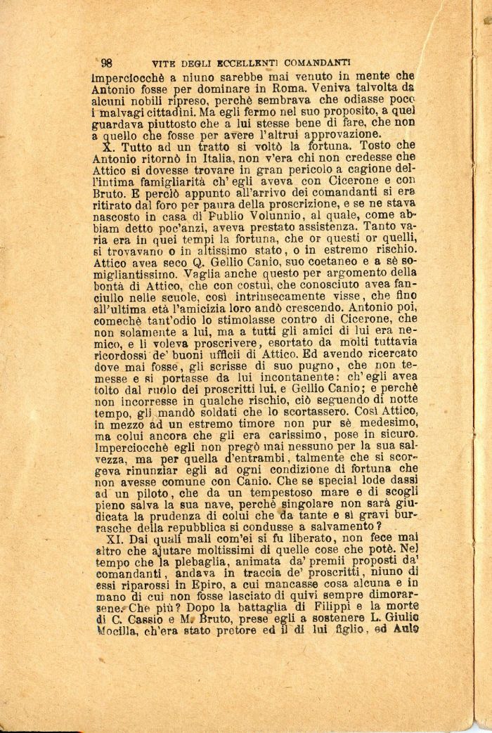X. Tutto ad un tratto si voltò la fortuna. Tosto che Antonio ritornò in Italia, non v'era chi non credesse che Attico si dovesse trovare in gran pericolo a cagione dell'intima famigliarità eh' egli aveva con Cicerone e con Bruto. E perciò appunto all'arrivo dei comandanti si era ritirato dal foro per paura della proscrizione, e se ne stava nascosto in casa di Publio Volunnio, al quale, come ab-biam detto poc'anzi, aveva prestato assistenza. Tanto varia era in quei tempi la fortuna, che or questi or quelli, si trovavano o in altissimo stato, o in estremo rischio. Attico avea seco Q. Gellio Canio, suo coetaneo e a sé somigliantissimo. Vaglia anche questo per argomento della bontà di Attico, che con costui, che conosciuto avea fanciullo nelle scuole, cosi intrinsecamente visse, che fino all'ultima età l'amicizia loro andò crescendo. Antonio poi, comechè tant'odio lo stimolasse contro di Cicerone, che non solamente a lui, ma a tutti gli amici di lui era nemico, e li voleva proscrivere, esortato da molti tuttavia ricordossi de' buoni ufflcii di Attico. Ed avendo ricercato dove mai fosse, gli scrisse di suo pugno , che non temesse e si portasse da lui incontanente: ch'egli avea tolto dal ruolo dei proscritti lui, e Gellio Canio; e perchè non incorresse in qualche rischio, ciò seguendo di notte tempo, gli mandò soldati che lo scortassero. Cosi Attico, in mezzo ad un estremo timore non pur sé medesimo, ma colui ancora che gli era carissimo, pose in sicuro. Imperciocché egli non pregò mai nessuno per la sua salvezza, ma per quella d'entrambi, talmente che si scorgeva rinunziar egli ad ogni condizione di fortuna che non avesse comune con Canio. Che se special lode dassi ad un piloto, che da un tempestoso mare e di scogli pieno salva la sua nave, perchè singolare non sarà giudicata la prudenza di colui che da tante e si gravi burrasche della repubblica si condusse a salvamento ?