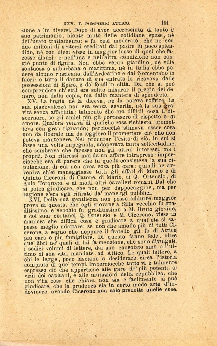 XVI. Della sua gentilezza non posso addurre maggior prova di questa, che egli giovane a Siila vecchio fu graditissimo, e vècchio fu graditissimo a M-. Bruto giovine, e coi suoi coetanei Q. Ortensio e M. Cicerone, visse in maniera che difficil cosa è giudicare a qual età si sapesse meglio adattare: se non che amollo più di tutti Cicerone, a segno che neppure, il fratello gli fu di Attico più caro o più famigliare. Di questo fanno fede, oltre que' libri ne' quali di lui fa menzione, che sono divulgati, i sedici volumi di lettere, dal suo consolato sino all' ultimo di sua vita, mandate ad Attico. Le quali lettere, a chi le legge, poco lasciano a desiderare circa l'istoria compiuta di que' tempi. Imperciocché tutto vi è talmente espresso ciò che appartiene alle gare de' più potenti, ai vizii dei capitani, e alle mutazioni della repubblica, che non v'ha cosa che chiara, non sia e facilmente si può giudicare, che la prudenza sia in certo modo arte d'indovinare. avendo Cicerone non solo predette quelle cosa,