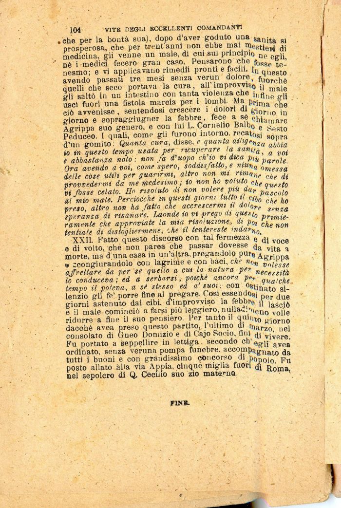 XXII. Fatto questo discorso con tal fermezza „ e di volto, che non parea che passar dovesse r(a morte, ma d^una casa in un'altra, pregandolo pure i» ¦ ' » scongiurandolo con lagrime e con baci, che n„n rippa affrettare da per sé quello a cut la natura per ne ,SSJ lo conduceva; ed a serbarsi, poiché ancora prr¦ 0*e,f j tempo il poteva, a sé stesso ed a' suoi ; con ^Htina lenzio gli fe' porre fine al preg-are. Cosi essendosi ri J ,sl giorni astenuto dai cibi, d'improvviso la febbr<> jj K,r .? e il male cominciò a farsi più leggiero, nùllau:i,en 9! ridurre a fine il suo pensiero. Per tanto il quii,l0 °.volle dacché avea preso questo partito, l'ultimo di ltiarKl0rn(? consolato di Gneo Domizio e di Cajo Socio, fini (ìj z?- el Fu portato a seppellire in lettiga. secondo eh' fts,]}lvRre' ordinato, senza veruna pompa funebre, accomp^g?' taVja tutti i buoni e con grandissimo concorso di lionnl ° IT posto allato alla via Appia. cinque miglia fuor! i i0, 1,11 nel sepolcro di Q. Cecilie suo zio materna. «.orna,