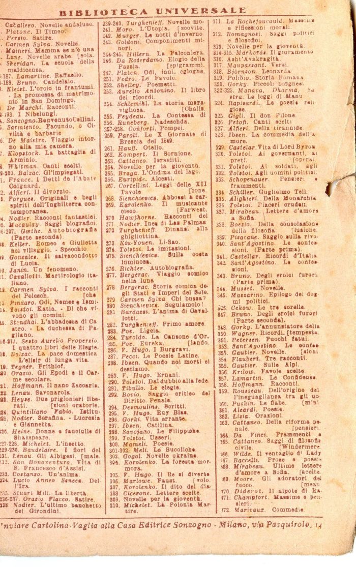 334 Schiller. Guglielmo Teli. 133. Alighieri. Della Monarchi* 336. Tolstoi. Piaceri crudeli. 387. Mirabeau.. Lettere d'amor« & Sofia.