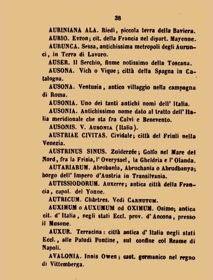 AUSONIA. Antichissimo nome dato al tratto dell' Italia meridionale che sta fra Calvi e Benevento.
