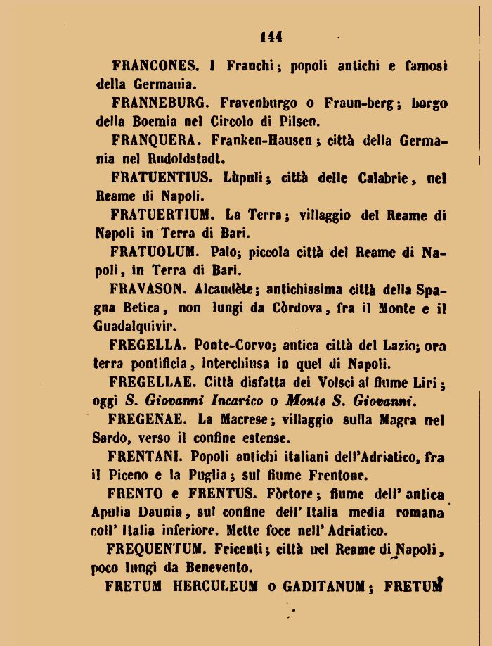 FRENTANI. Popoli antichi italiani dell'Adriatico, fra il Piceno e la Puglia; sul fiume Frentone.