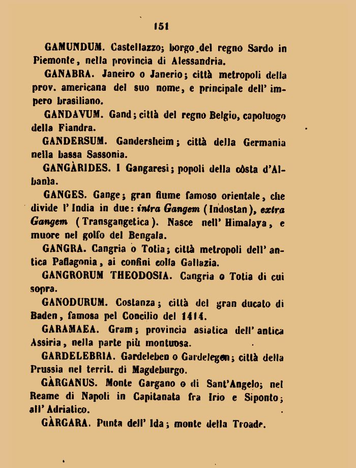 GANGES. Gange; gran fiume famoso orientale, che divide T India in due : intra Gangem ( Indostan ), extra Gangem ( Transgangetica ). Nasce nell' Himalaya , e muore nel golfo del Bengala.