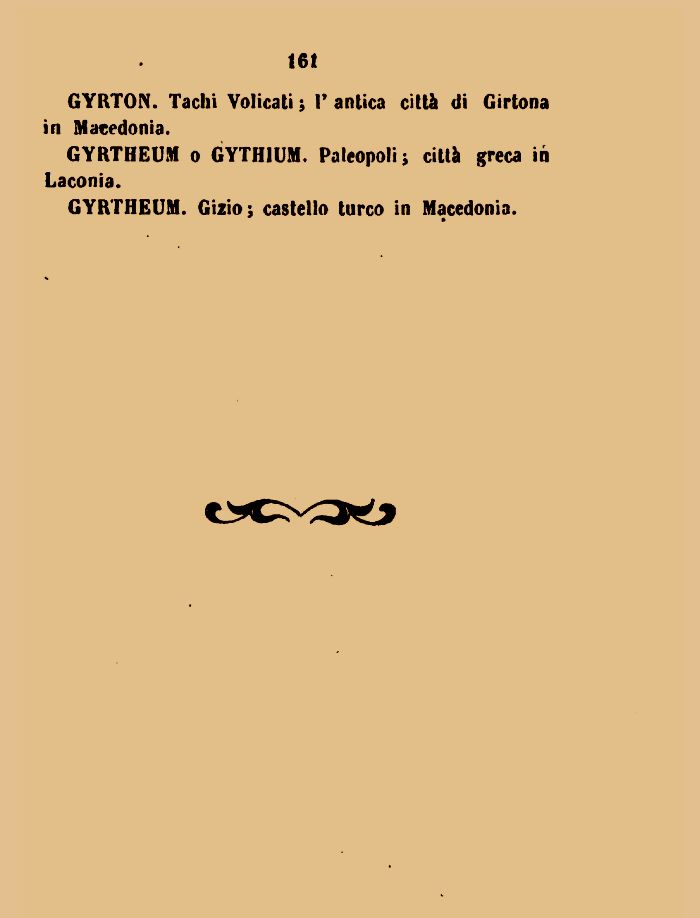 161 GYRTON. Tacili Volicati ; P antica cittą di Girtona in Macedonia. GYRTHEUM o GYTH1UM. Paleopoli ; cittą greca in Laconia. GYRTHEUM. Gizio; castello turco in Macedonia. i