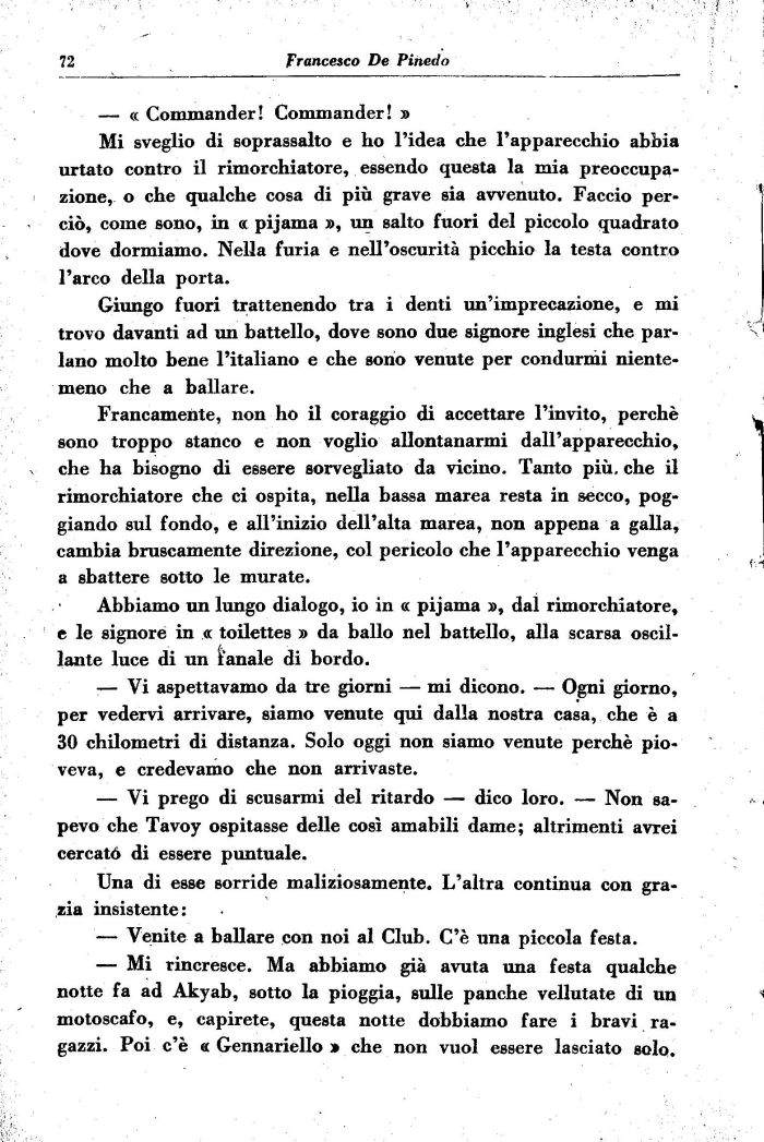 — Mi rincresce. Ma abbiamo già avuta una festa qualche notte fa ad Akyab, sotto la pioggia, sulle panche vellutate di un motoscafo, e, capirete, questa notte dobbiamo fare i bravi ragazzi. Poi c'è e Gennariello * che non vuol essere lasciato solo.