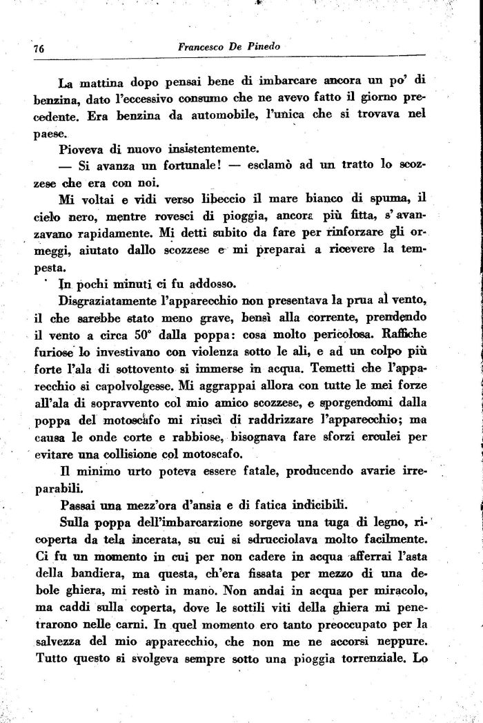 Disgraziatamente l'apparecchio non presentava la prua al vento, il che sarebbe etato meno grave, bensì alla corrente, prendendo il vento a circa 50° dalla poppa: cosa molto pericolosa. Raffiche furiose lo investivano con violenza sotto le ali, e ad un colpo più forte l'ala di sottovento si immerse in acqua. Temetti che l'apparecchio si capolvolgesse. Mi aggrappai allora con tutte le mei forze all'ala di sopravvento col mio amico scozzese, e sporgendomi dalla poppa del motoscafo mi riuscì di raddrizzare l'apparecchio; ma causa le onde corte e rabbiose, bisognava fare sforzi erculei per evitare una collisione col motoscafo.