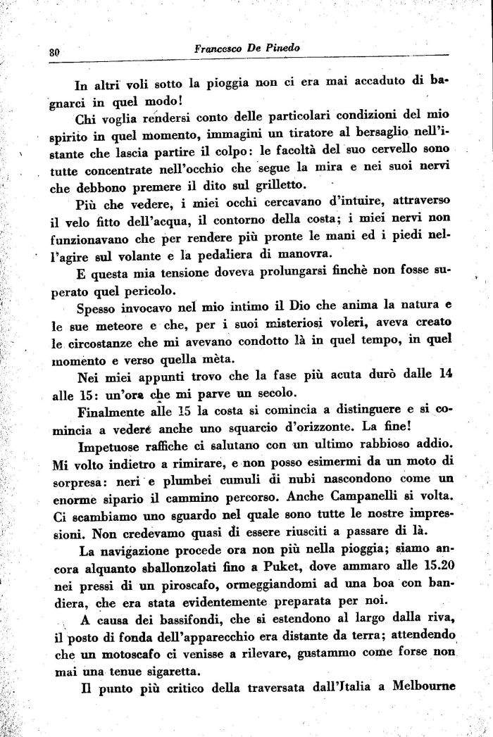 Più che vedere, i miei occhi cercavano d'intuire, attraverso il velo fitto dell'acqua, il contorno della costa; i miei nervi non funzionavano che per rendere più pronte le mani ed i piedi nel-l'agire sul volante e la pedaliera di manovra.