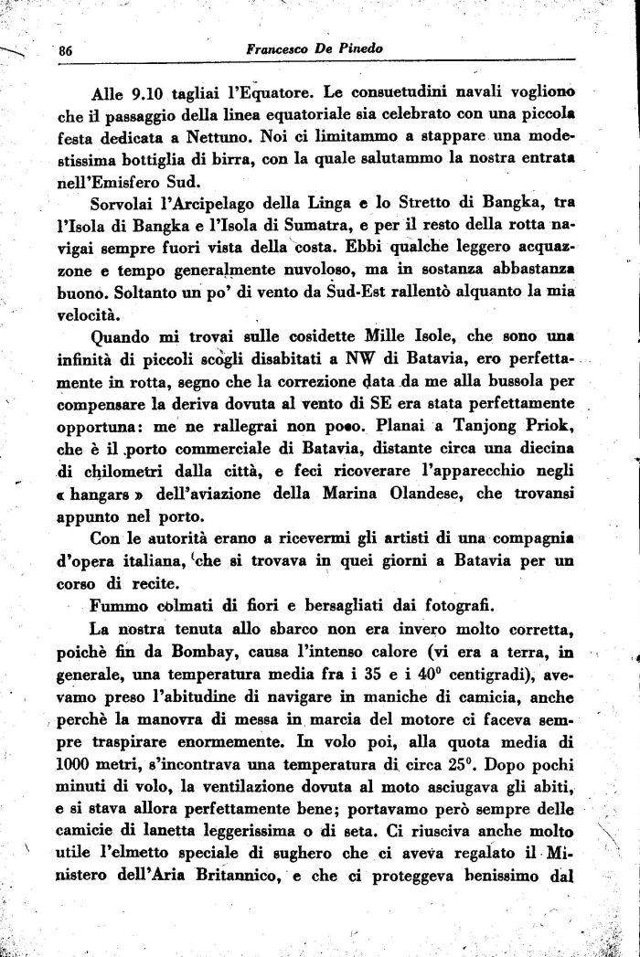 La nostra tenuta allo sbarco non era invero molto corretta, poiché fin da Bombay, causa l'intenso calore (vi era a terra, in generale, una temperatura media fra i 35 e i 40° centigradi), avevamo preso l'abitudine di navigare in maniche di camicia, anche perchè la manovra di messa in marcia del motore ci faceva sempre traspirare enormemente. In volo poi, alla quota media di 1000 metri, s'incontrava ima temperatura di circa 25°. Dopo pochi minuti di volo, la ventilazione dovuta al moto asciugava gli abiti, e si stava allora perfettamente bene; portavamo però sempre delle camicie di lanetta leggerissima o di seta. Ci riusciva anche molto utile l'elmetto speciale di sughero che ci aveva regalato il Ministero dell'Aria Britannico, e che ci proteggeva benissimo dal