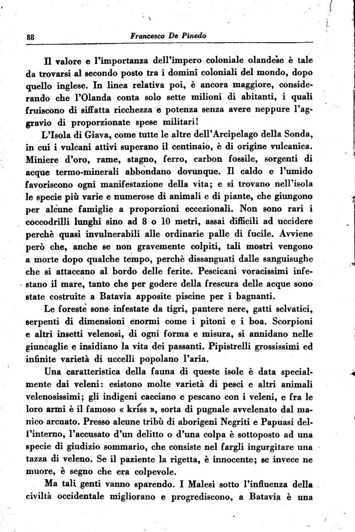 Una caratteristica della fauna di queste isole è data specialmente dai veleni: esistono molte varietà di pesci e altri animali velenosissimi; gli indigeni cacciano e pescano con i veleni, e fra le loro armi è il famoso « kriss », sorta di pugnale avvelenato dal manico arcuato. Presso alcune tribù di aborigeni Negriti e Papuasi dell'interno, l'accusato d'un delitto o d'una colpa è sottoposto ad una specie di giudizio sommario, che consiste nel fargli ingurgitare una tazza di veleno. Se il paziente la rigetta, è innocente; se invece ne muore, è segno che era colpevole.