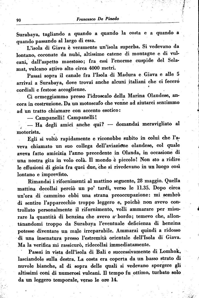 Rimandai i rifornimenti al mattino seguente, 28 maggio. Quella mattina decollai perciò un po' tardi, verso le 11.35. Dopo circa un'ora di cammino ebbi una strana preoccupazione: mi sembrò di sentire l'apparecchio troppo leggero e, poiché non avevo controllato personalmente il rifornimento, volli ammarare per misurare la quantità di benzina che avevo a'bordo; temevo che, allontanandomi troppo da Surabaya l'eventuale deficienza di benzina potesse diventare un male irreparabile. Ammarai quindi a ridosso di una insenatura presso l'estremità orientale dell'Isola di Giava. Ma la verifica mi rassicurò, ridecollai immediatamente.
