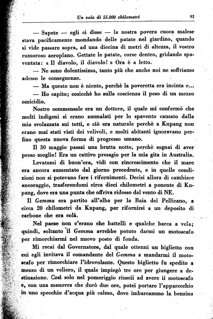 Mi recai dal Governatore, dal quale ottenni un biglietto con cui egli invitava il comandante del Gemma a mandarmi il motoscafo per rimorchiare l'idrovolante. Questo biglietto fu spedito a mezzo di un veliero, il quale impiegò tre ore per giungere a destinazione. Così solo nel pomeriggio riuscii ad avere il motoscafo e, con una manovra che durò due ore, potei portare l'apparecchio in uno specchio d'acqua più calmo, dove imbarcammo la. benzina