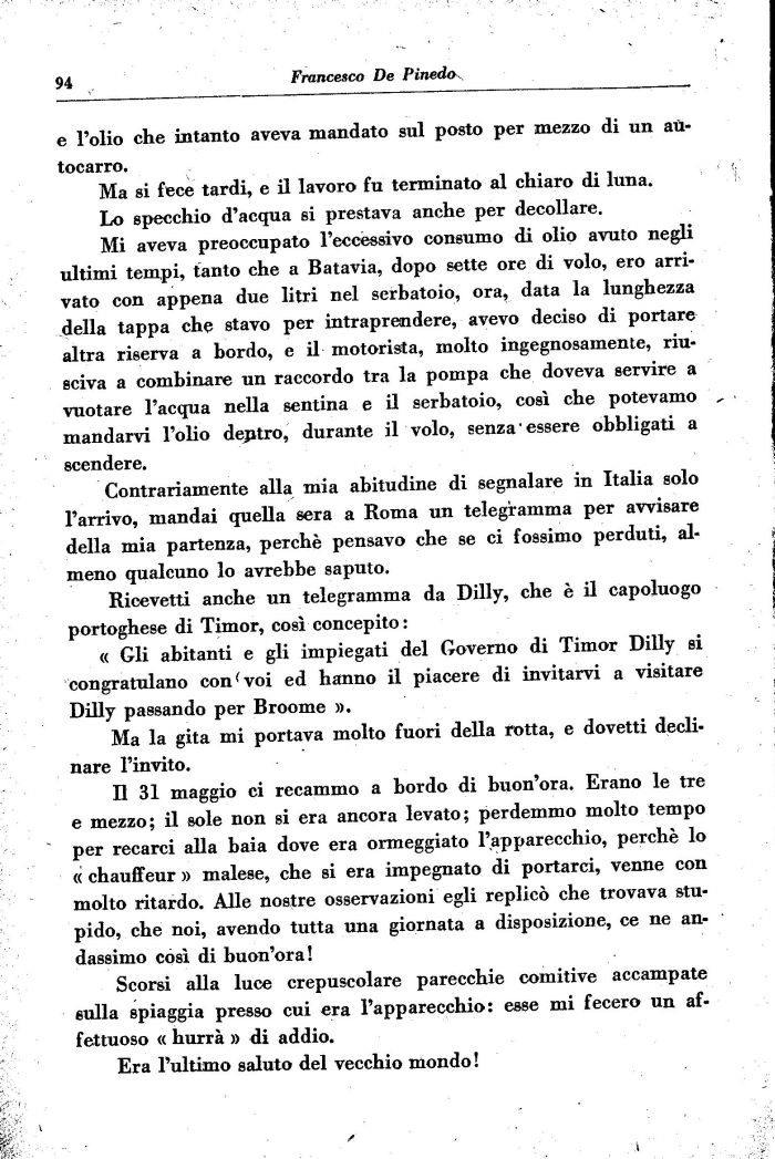 Mi aveva preoccupato l'eccessivo consumo di olio avuto negli ultimi tempi, tanto che a Batavia, dopo sette ore di volo, ero arrivato con appena due litri nel serbatoio, ora, data la lunghezza .della tappa che stavo per intraprendere, avevo deciso di portare altra riserva a bordo, e il motorista, molto ingegnosamente, riusciva a combinare un raccordo tra la pompa che doveva servire a vuotare l'acqua nella sentina e il serbatoio, così che potevamo mandarvi l'olio deptro, durante il volo, senza ' essere obbligati a scendere.